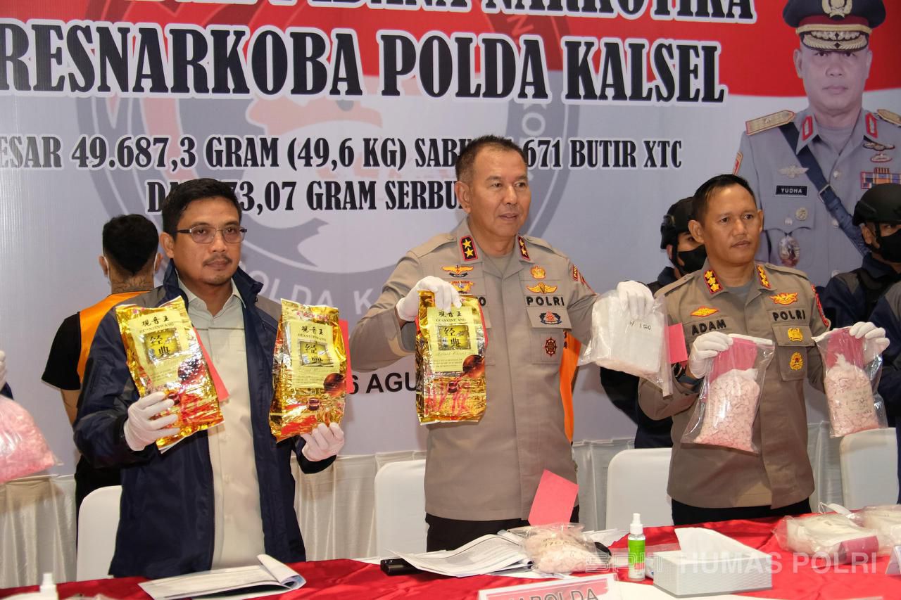 Dalam kesempatan tersebut, Polda Kalsel mengumumkan keberhasilan Direktorat Resnarkoba dalam mengamankan 50 kilogram Sabu, 15.671 butir XTC, serta 173,07 gram serbuk XTC. Selain barang bukti narkotika, petugas juga berhasil menangkap dua orang tersangka yang terlibat dalam jaringan peredaran narkoba tersebut.