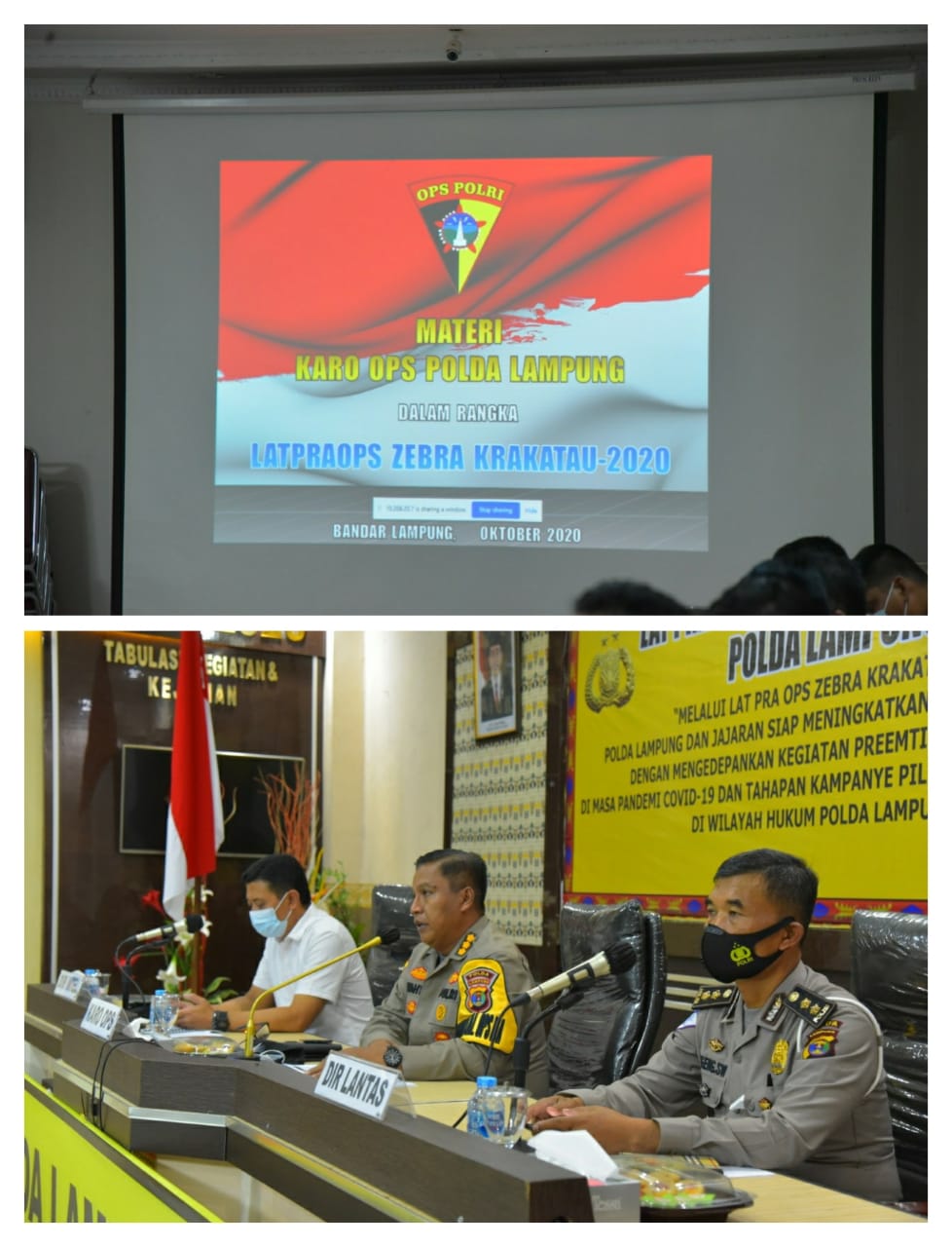 Kapolda Lampung Irjen Pol Drs Purwadi Arianto M.Si., menyampaikan pada Operasi Zebra Krakatau 2020 tahun ini, salah satu yang menjadi fokus yaitu keselamatan bagi pengguna jalan dimasa adaptasi kebiasaan baru untuk mencegah terjadinya penyebaran penularan Covid-19, dengan cara bertindak penegakkan hukum disertai kegiataan preemtif dan preventif secara selektif prioritas, untuk mencapai tujuan tersebut operasi ini dilaksanakan dengan tindakan kepolisian di bidang lalu lintas yaitu tindakam represif 20%, tindakan preemtif 40%, tindakan preventif 40%, dengan tetap mengedepankan tindakan humanis serta memperhatikan Protokol Kesehatan, serta selama dalam melaksanakan yang tugas harus dipedomani yaitu :