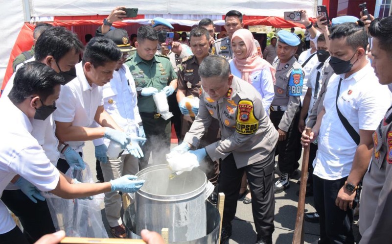 Kapolda Sulteng Irjen. Pol. Dr. Agus Nugroho, S.I.K., S.H., M.H., memimpin langsung pemusnahan barang bukti narkotika jenis sabu seberat 20.347,29 gram hasil pengungkapan kasus jaringan internasional, pada Rabu (13/9/23).