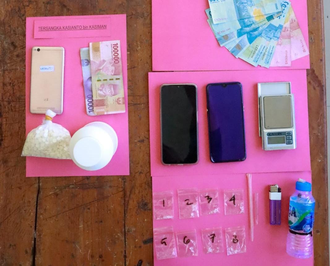 Dari tangan pekerja serabutan itu, polisi menyita 8 plastik klip masing-masing berisi sabu dengan jumlah total 2,1 gram; pipet kaca berisi sisa sabu 1,4 gram; timbangan elektrik; uang Rp 500 ribu dan 2 (dua) unit Handphone.