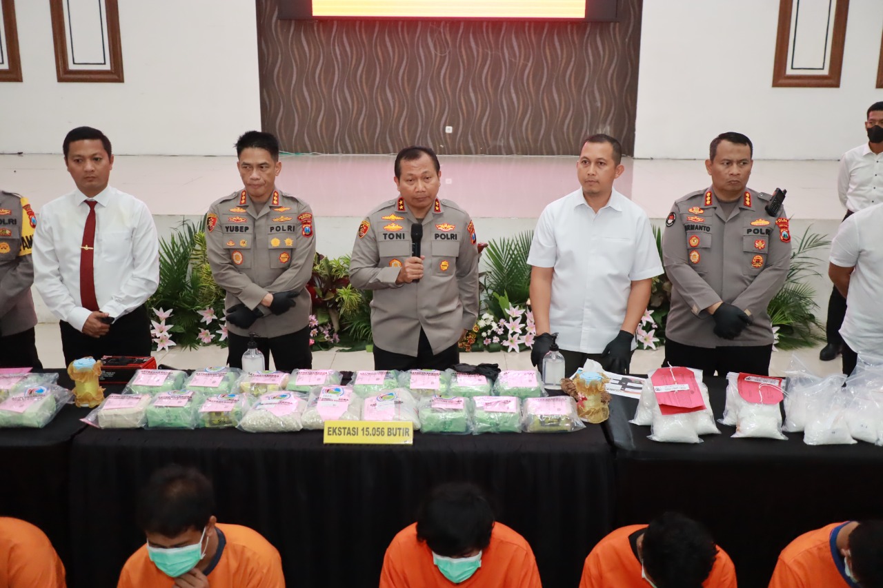 SURABAYA – Maspolin.id|| Polda Jatim berkolaborasi dengan Polrestabes Surabaya Surabaya, berhasil menggagalkan narkotika jenis sabu-sabu sebanyak 36 kilogram dan 15 ribu ekstasi dengan tersangka total tujuh orang yang diperkirakan berasal dari jaringan Internasional.