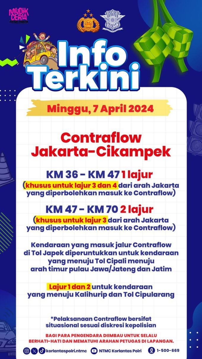 JAKARTA – Maspolin.id|| Korlantas Polri masih memberlakukan rekayasa arus lalu lintas (lalin) lawan arah alias contraflow di arus mudik ini. Terbaru, per Minggu (7/4/2024) dini hari, berlaku contraflow 1 lajur di KM 36-47 dan 2 lajur di KM 47-70.
