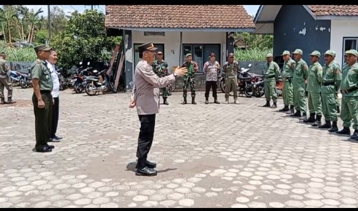 Tampak Kapolsek Jelbuk Iptu Brisan Iman Nuila. SH, Kepala Kantor Camat Jelbuk, Nurul Hfidz Yasin dan Komandan Koramil Jelbuk, Kapt. Arm. Anton Hermawan memberikan arahan sedikitnya kepada 65 anggota Linmas.