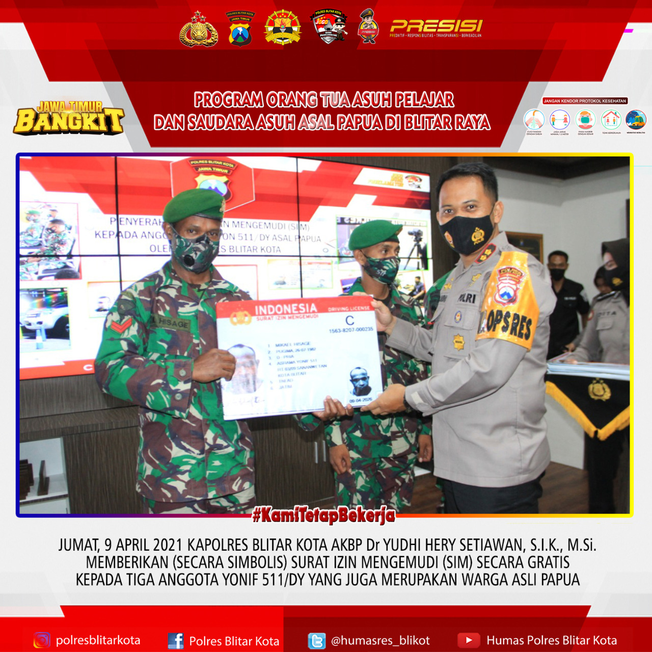 Dalam kegiatan itu juga penyerahan SIM kepada warga papua (3 anggota Yonif 511/DIY Blitar oleh Kapolres Blitar Kota.