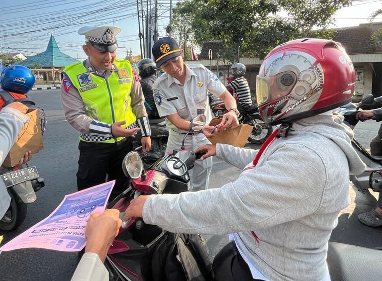 Para petugas membagikan souvenir dan brosur himbuan keselamatan kepada pengguna jalan yang melintas di traffic light jalan Ahmad Yani Kecamatan Kota Bojonegoro, Rabu(26/7/2023).