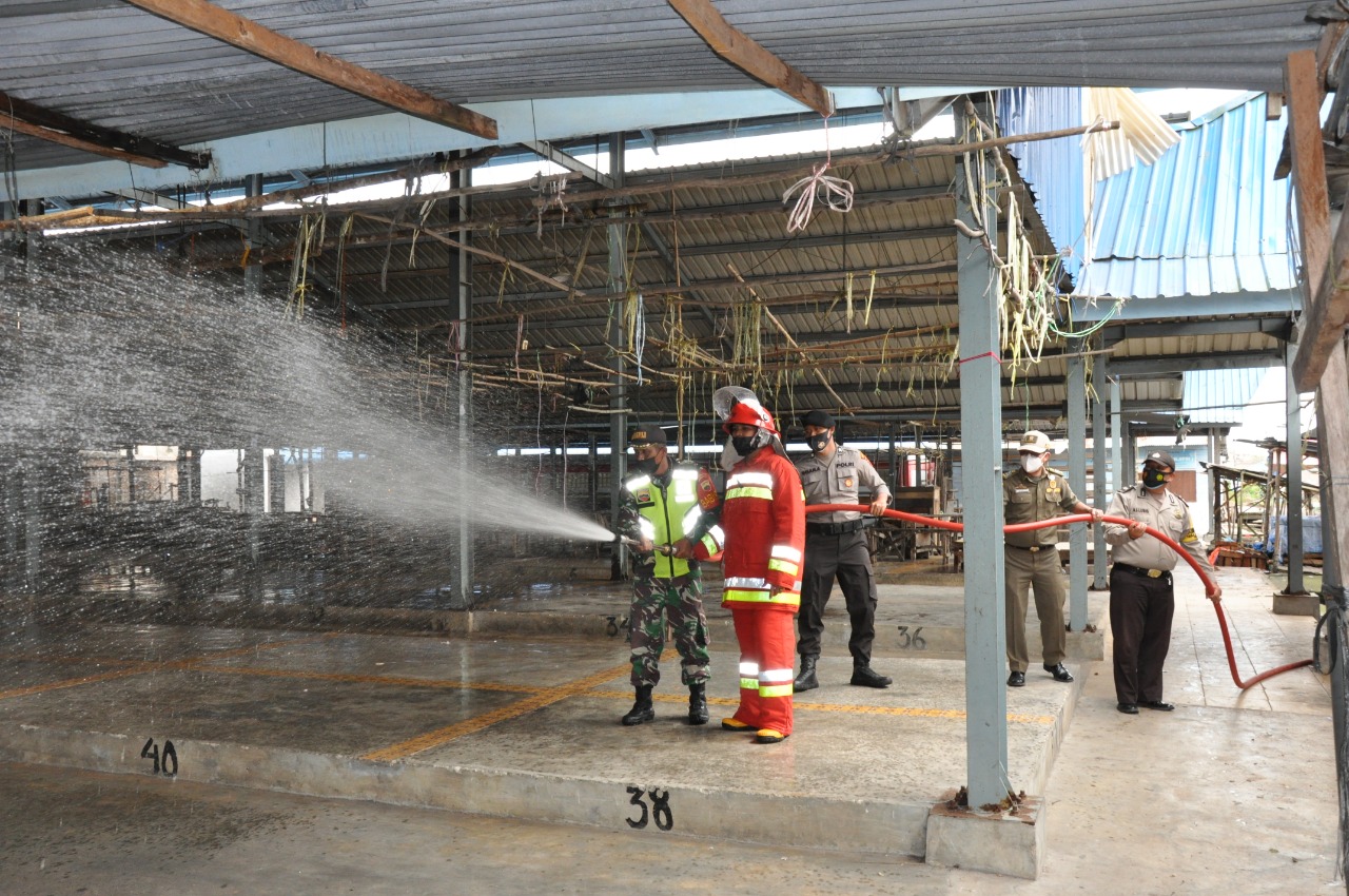Penyemprotan dilakukan dengan menggunakan mobil damkar dan alat pompa semprot yang berisi cairan disinfektan.