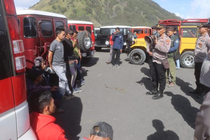 Probolinggo – Maspolin.id|| Polres Probolinggo Polda Jatim bersama pihak Taman Nasional Bromo Tengger Semeru (TNBTS) memberikan himbauan dan sosialisasi kepada para wisatawan pengunjung Gunung Bromo, driver Jeep hartop serta komunitas wisata ojek kuda.