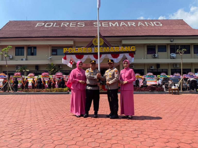 Kapolres Semarang yang baru AKBP Ike Yulianto Wicaksono, SH. SIK. MH., beserta Ibu Ketua Bhayangkari Cabang Semarang tampak disambut langsung pejabat lama AKBP Achmad Oka Mahendra SIK. MM., di loby Polres Semarang.