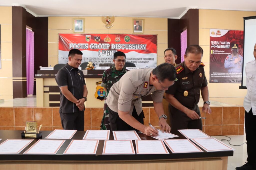 Tanggamus, LAMPUNG – Maspolin.id|| Polres Tanggamus menggelar Focus Group Discussion (FGD) terkait sinergitas dalam menjaga kondusifitas melalui optimalisasi penegakan Peraturan Daerah (Perda) Kabupaten Tanggamus Nomor 05 tahun 2017 tentang Pengaturan Umum Orgen Tunggal, Selasa 16 Mei 2023.