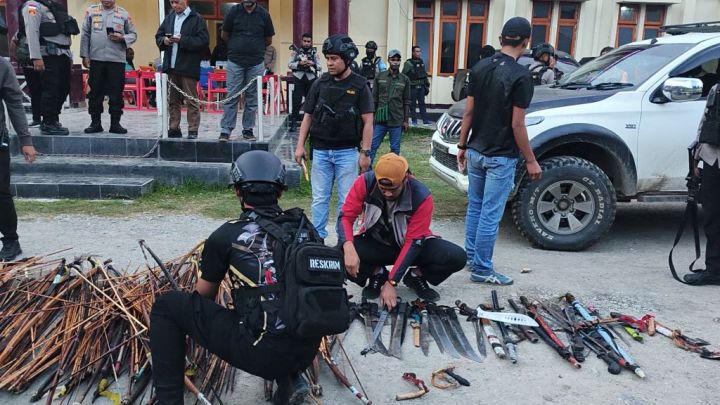 Adapun barang bukti hasil razia yang disita di antaranya busur sebanyak 72 Buah, Anak Panah sebanyak 689 Buah, Parang sebanyak 30 Buah, Badik sebanyak 7 Buah, Samurai sebanyak 3 Buah, Kampak sebanyak 2 Buah, Ketapel sebanyak 8 Buah, dan Bambu sebanyak 1 Buah, jika di totalkan alat tajam tersebut berjumlah 812 buah senjata tajam (Sajam).