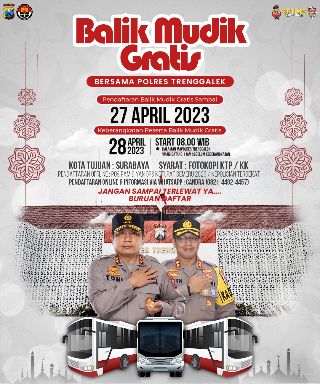 Bagi masyarakat yang berminat, pendaftaran balik mudik gratis ini akan diberangkatkan pada hari Jumat tanggal 28 April 2023 pukul 08.00 Wib di halaman Mapolres Trenggalek.