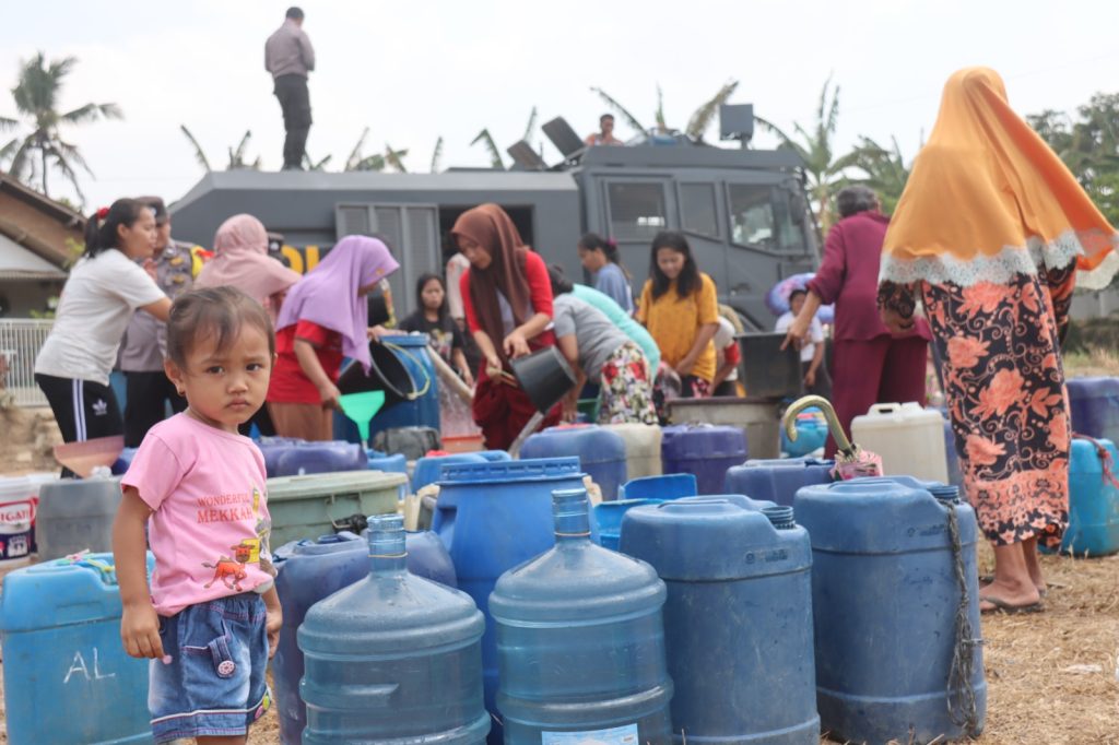 Kasi Humas Polresta Bandar Lampung Iptu Sunarto mewakili Kapolresta Bandar Lampung Kombes Pol Ino Harianto, S.I.K l., M.M. menjelaskan bahwa sebanyak 14 ribu liter air bersih dibagikan kepada puluhan warga yang terdampak kekeringan di Kampung Way Laga, Kecamatan Sukabumi Bandar Lampung.