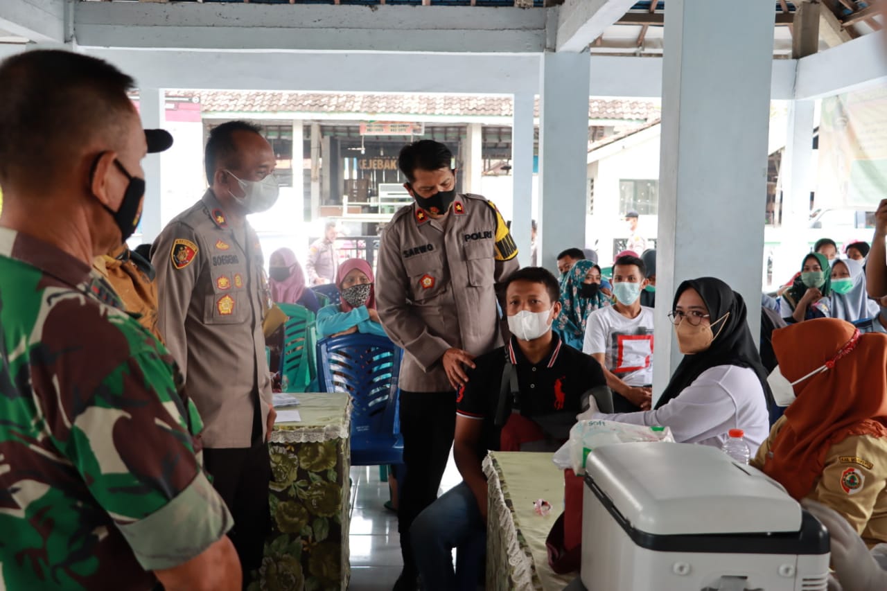 Kapolresta Mojokerto AKBP Rofiq Ripto Himawan, S.I.K., S.H., M.H diwakili Wakapolresta Mojokerto Kompol Dr. Sarwo Waskito, S.H., S.Sos, M.Hum., MM meninjau langsung proses Vaksinasi di Balai Desa Perning sekaligus Vidcon bersama Wakapolri Komjen Gatot Eddy Pramono.