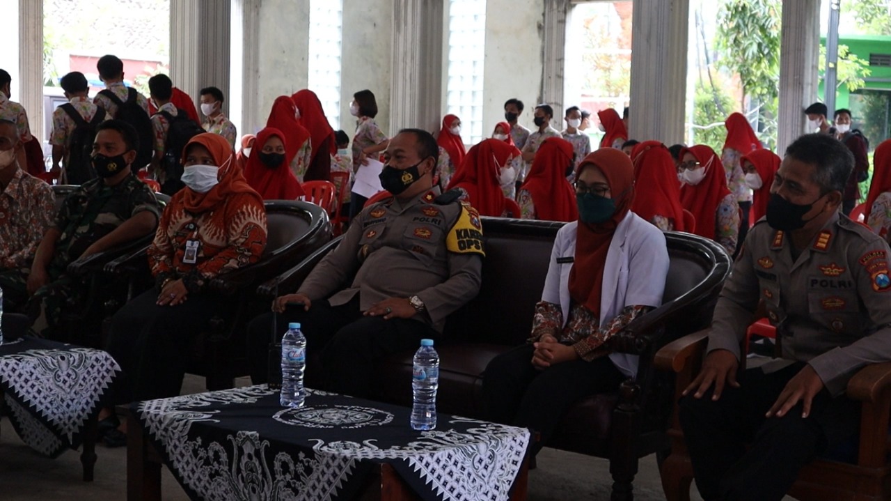 Kabagops dalam giat vaksinasi kali ini didampingi Kapolsek Dawarblandong, Kepala Sekolah SMA Negeri 1 Dawarblandong, dan pejabat utama diantaranya, Kasi Humas IPTU Moh. Khoirul Umam, Kasi Propam IPDA Yuda, Kasi TIK AIPDA Sunarto. (MK/DF)