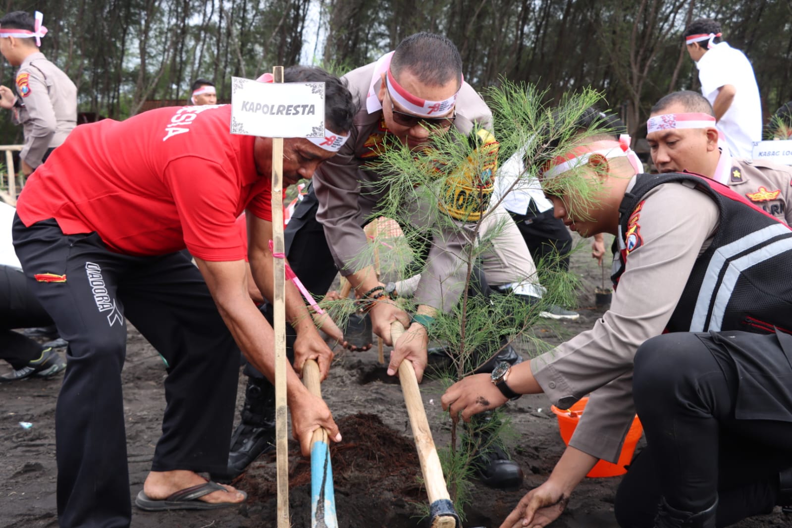 Kapolresta Banyuwangi, Kombes Pol Deddy Foury Millewa saat ditemui awak media di lokasi penanaman pohon yang berada di Pantai Cemara Banyuwangi mengatakan kegiatan tanam pohon serentak ini sebagian dari wujud Polri peduli penghijauan.
