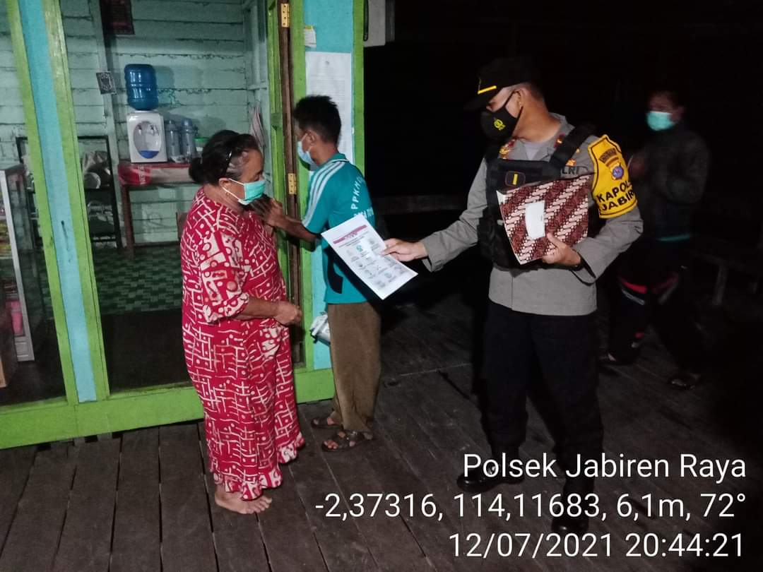 Pulang Pisau,maspolin.id- Polsek Jabiren Raya, Polres Pulang Pisau, Polda Kalteng, bersama dengan TNI, Pemerintahan Kecamatan, Pemerintahan Desa Tumbang Nusa dan Petugas PPKM Desa Tumbang Nusa mengelar patroli sekaligus mensosialisasikan Surat Edaran (SE) Gubernur Kalimantan Tengah Nomor: 443.1107 Satgas Covid-19 Tanggal 28 Juni 2021 Tentang Peningkatan Upaya Penanganan Covid-19 dan Percepatan Pelaksanaan Vaksinasi.