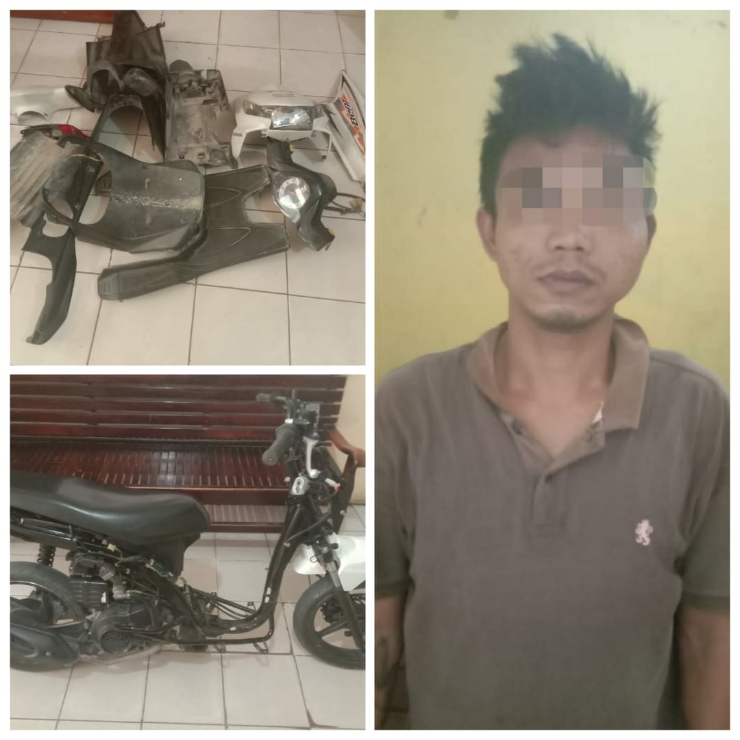Selain mengamankan pelaku, petugas juga mengamankan barang bukti 1 unit sepeda motor honda beat trondol tanpa nopol dan 1 set bodi sepeda motor honda beat yang sudah dipreteli.