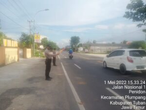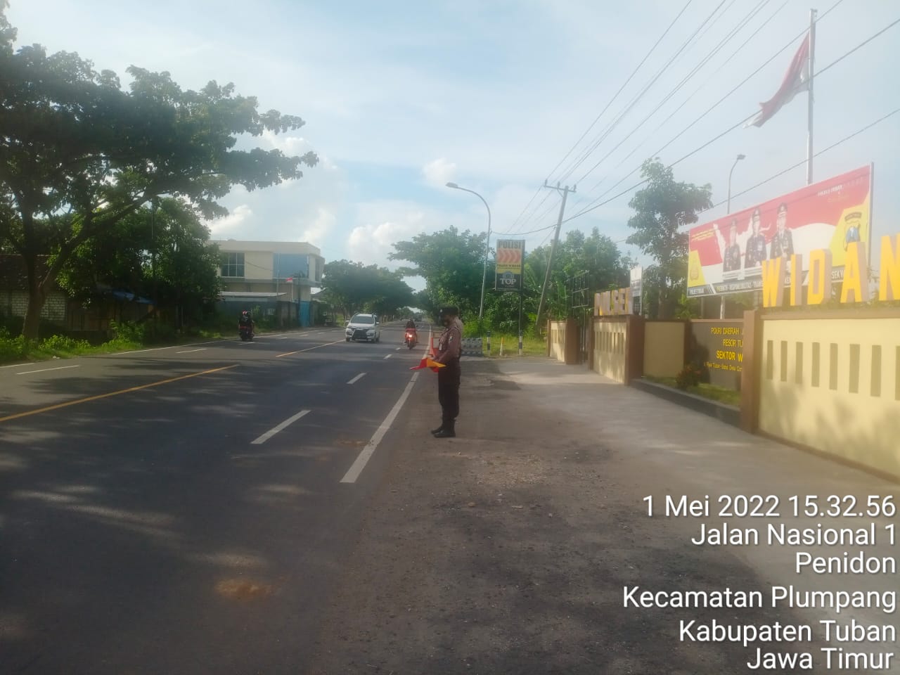 Widang ~ Maspolin.id// Personil Polsek Widang Polres Tuban melaksanakan pemantauan arus lalulintas jalur Pantura depan Kantor Polsek Widang, Minggu (01/05/22).