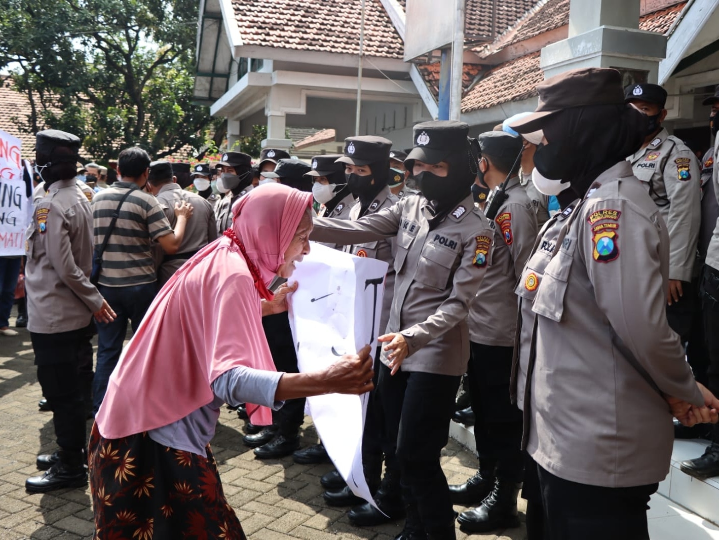 Sakdiyah atau sering dipanggil dengan nama sapaan Bu Kardi (62) tersebut tiba-tiba mengalami pusing dan hampir pingsan, saat beraksi di bawah terik matahari. Petugas Polwan Polres Probolinggo yang melaksanakan pengamanan aksi dengan sigap memberikan pertolongan.