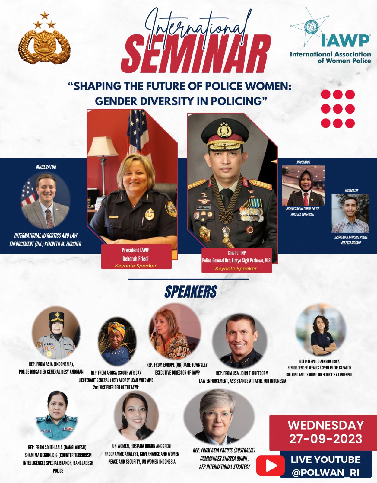 Dalam diskusi ini, hadir Kapolri Jenderal Pol. Listyo Sigit Prabowo dan Presiden IAWP, Deborah Friedl, sebagai pembicara utama.
