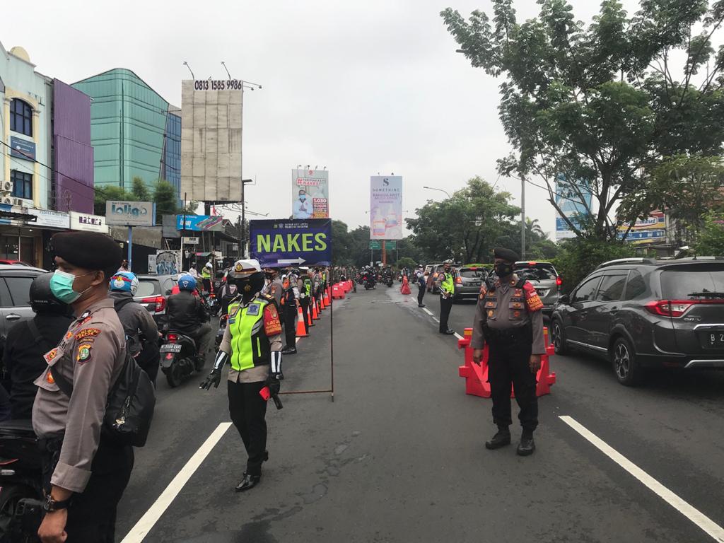 MASPOLIN.ID.-DEPOK- Pemerintah kembali memperpanjang masa Pemberlakuan Pembatasan Kegiatan Masyarakat (PPKM) Darurat terhitung tanggal, 10-16 Agustus 2021. Untuk itu <span;>Polres Metro Depok bersama petugas gabungan kembali melakukan penyekatan disejumlah ruas jalan protokol di Kota Depok, Selasa (10/08/2021).