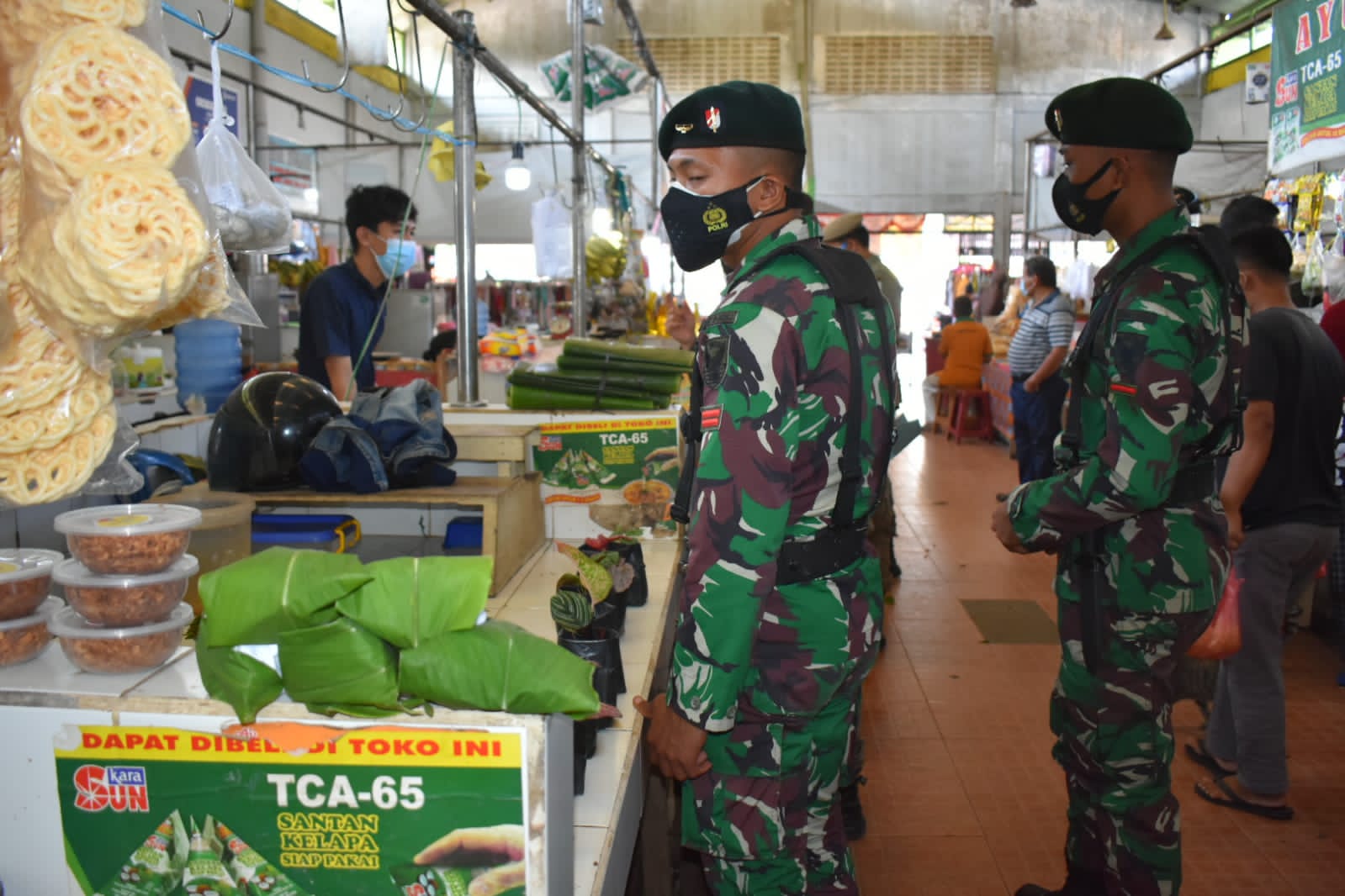 Tim Gabungan saat patroli PPKM ke Pasar Tradisional Pasar Mama di Puri Mayang dan ke Pasar Tradisional Kelurahan Selamat, menghimbau kepada pengunjung dan pedagang agar tetap melaksanakan protokol kesehatan dan bagi warga yang belum divaksin untuk segera Vaksin dan selalu mentaati protkes selama berada di lingkungan pasar.