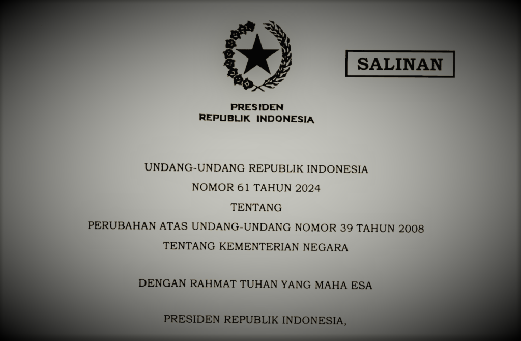 Maspolin.id|| Presiden Joko Widodo (Jokowi) telah mengesahkan Undang-Undang (UU) Nomor 61 Tahun 2024 tentang Kementerian Negara, yang merupakan perubahan atas UU Nomor 39 Tahun 2008 tentang Kementerian Negara. UU ini bertujuan untuk meningkatkan fleksibilitas dalam pembentukan dan pengelolaan kementerian, sejalan dengan kebutuhan pemerintahan yang terus berkembang.