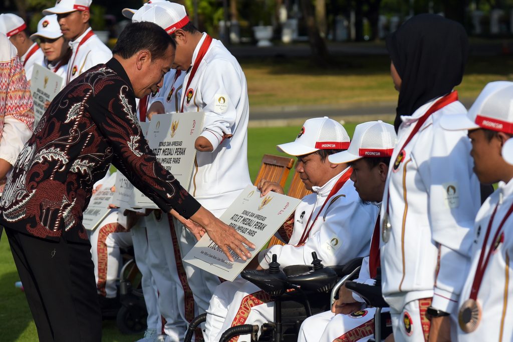 Maspolin.id|| Presiden Joko Widodo (Jokowi) memberikan bonus dan apresiasi kepada para atlet Paralimpiade Indonesia yang berlaga pada Paralimpiade Paris 2024. Acara penyerahan apresiasi ini berlangsung di halaman depan Istana Merdeka, Jakarta, Rabu (11/09/2024).