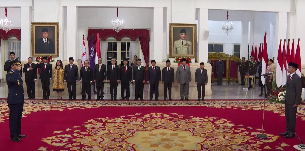 Usai pembacaan Keppres, Presiden Jokowi melakukan penyematan tanda jabatan, dilanjutkan dengan pengambilan sumpah/janji jabatan.
