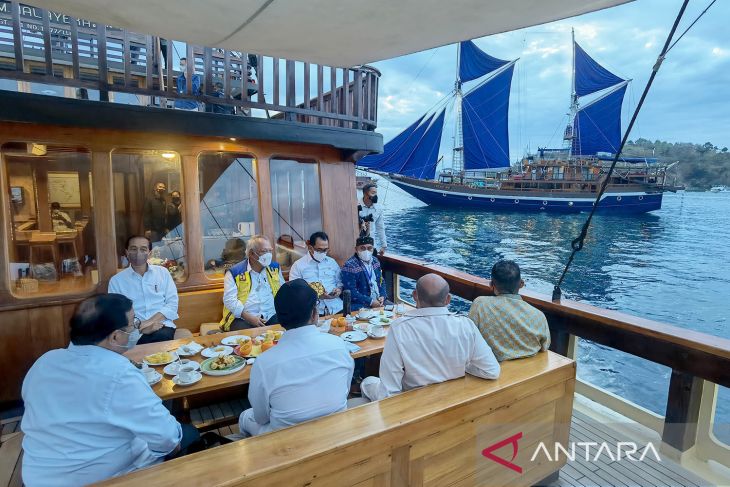 Maspolin.id|| Presiden Joko Widodo (kiri) bersama Ibu Negara Iriana Joko Widodo berada di atas kapal pinisi menuju Pulau Rinca Taman Nasional Komodo, Kabupaten Manggarai Barat, Nusa Tenggara Timur, Kamis (21/7/2022).