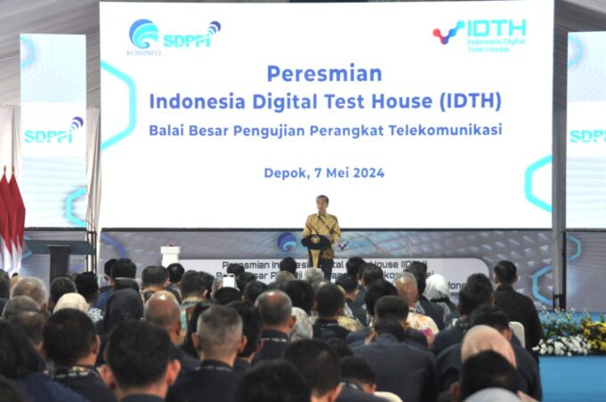 Maspolin.id|| Presiden RI Joko Widodo (Jokowi) meresmikan Indonesia Digital Test House (IDTH) di Balai Besar Pengujian Perangkat Telekomunikasi (BBPPT) di Kota Depok, Provinsi Jawa Barat, Selasa (05/07/2024). Presiden menyatakan bahwa IDTH sebagai fasilitas pengujian perangkat berstandar internasional yang dilengkapi dengan peralatan canggih, nantinya akan digunakan untuk menguji berbagai jenis perangkat digital dari luar dan dalam negeri, mulai dari telpon genggam hingga akses poin televisi digital.