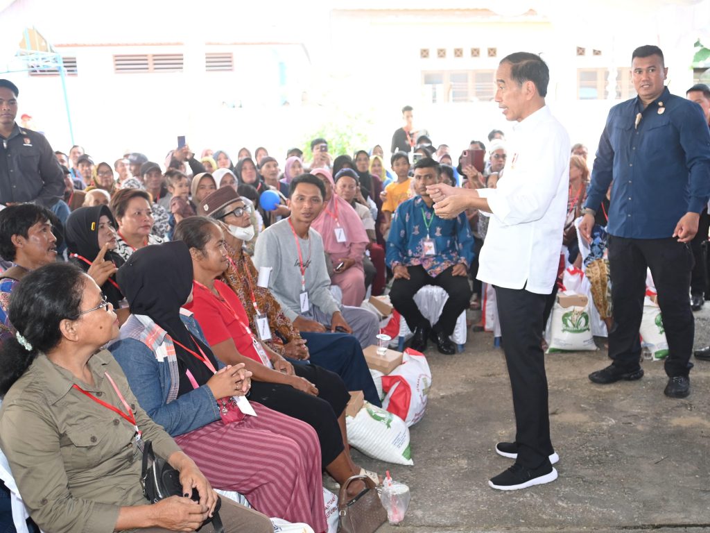 Maspolin.id|| Presiden RI Joko Widodo (Jokowi) melakukan peninjauan stok beras dan penyerahan bantuan cadangan pangan pemerintah di Gudang Bulog Buntok, Kabupaten Barito Selatan, Kalimantan Tengah, pada Kamis (27/06/2024). Presiden memastikan kelancaran distribusi bantuan pangan serta mengecek ketersediaan stok beras nasional yang dikelola oleh Bulog.