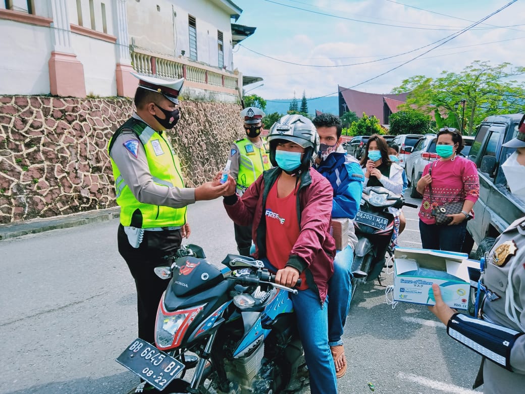 Dipimpin Kasat Lantas AKP Soya Lato SH mewakili Kapolres AKBP Muhammad Saleh, SH, MM menghadiahi puluhan helm SNI, ratusan masker dan handsanitizer bagi pengemudi kenderaan roda dua roda empat pengguna jalan raya, terang Walpon Baringbing.