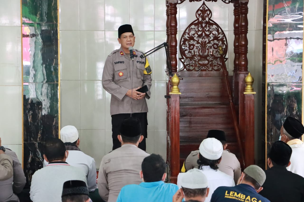 maspolin.id, Mojokerto – Dalam menjalin kedekatan dan kebersamaan dengan warga, Jajaran Polresta Mojokerto yang dipimpin Kapolresta Mojokerto AKBP Rofiq Ripto Himawan diwakili Wakapolresta Mojokerto Kompol Dr. Sarwo Waskito melaksanakan safari jumat di Masjid Jami Roudlotul Jannah Jln. Meri 348 Kel. Meri Kec. Kranggan Kota Mojokerto, Jumat (25/03/2022).