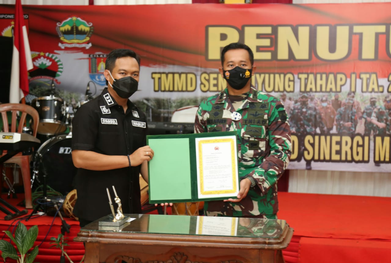 Hal ini ditandai dengan penandatanganan naskah dan prasasti serta penyerahan hasil proyekTMMD oleh Dansatgas TMMD Kodim 0703 Cilacap Letkol Inf Andi Afandi, S.I.P kepada Pemerintah Kabupaten (Pemkab) Cilacap dalam hal ini oleh Wakil Bupati (Wabup) Syamsul Aulia Rahman, S.S.TP., M.Si, bertempat di Balai Desa Karangkemiri, Kecamatan Jeruklegi, Kabupaten Cilacap, Rabu (31/3).