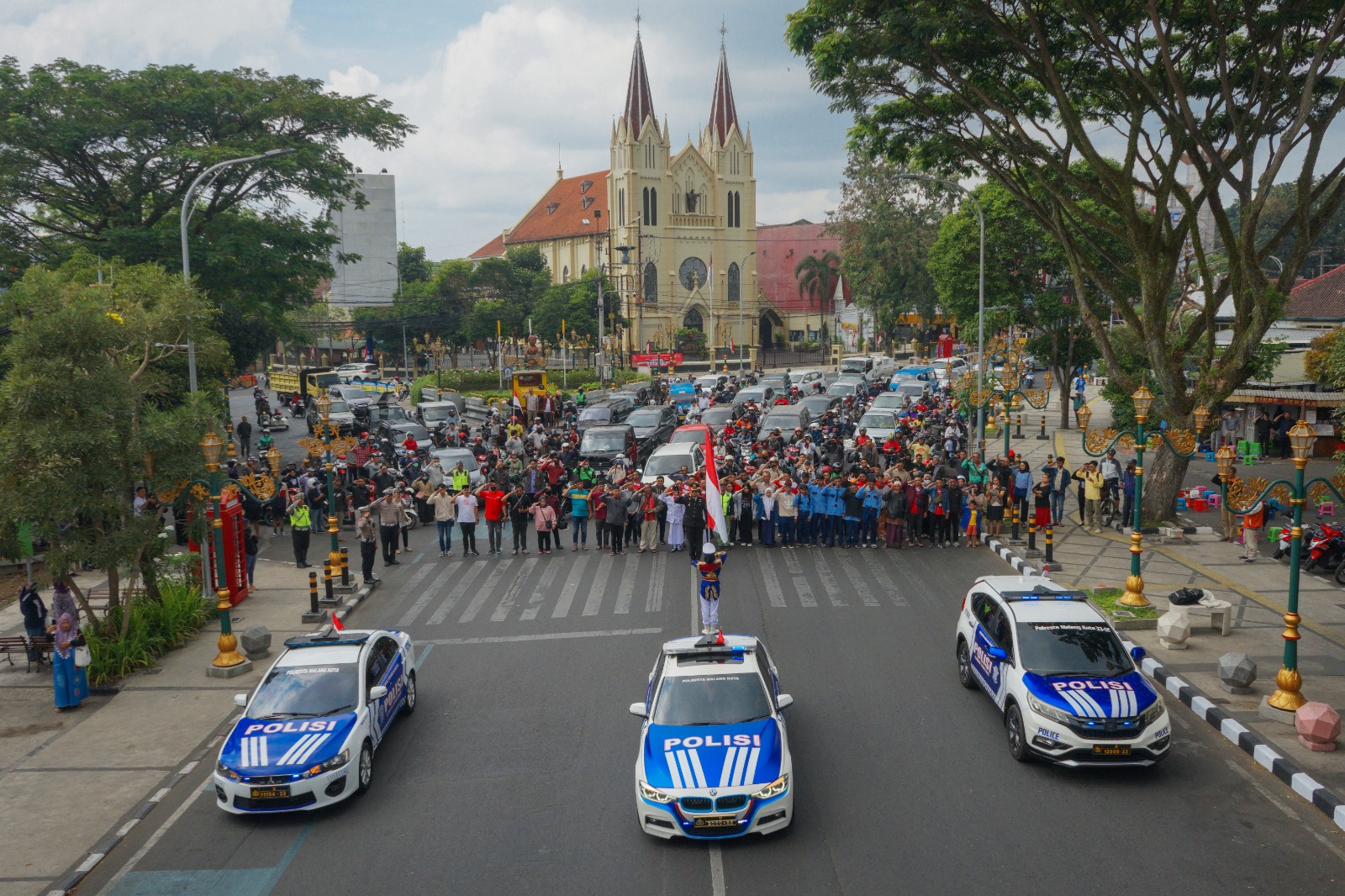 Tampak Kasat Lantas Polresta Malang Kota Kompol Akhmad Fani Rakhim S.Psi, S.I.K, M.Psi. diikuti anggota satlantas yang bertugas, pengendara dan masyarakat di depan Gereja Kayu Tangan serentak memberikan penghormatan kepada bendera merah putih saat detik-detik Proklamasi kemerdekaan RI dengan diiringi lantunan lagu Kebangsaan Indonesia Raya.