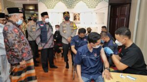 maspolin.id, Surabaya– Forkopimda Jawa Timur diantaranya Kapolda Jatim Irjen Pol Nico Afinta, Gubernur Jatim yang diwakili Asisten III Administrasi Umum Sekda Prov Jatim Syaichul Ghulam, Pangdam V/Brawijaya yang diwakili Dandim 0832 Surabaya Selatan Kolonel Kav Jacob Janes Patty bersama Ketua PW NU Jatim KH Marzuki Mustamar dan Kakanwil Kemenag Jatim Husnul Maram pada Kamis (21/4/2022) mengecek Vaksinasi serentak dosis 2 dan dosis 3 booster yang digelar secara serentak oleh PWNU Jatim, Kanwil Kemenag Jatim dan Forkopimda Jatim dengan target 71.131 dosis perhari selama tiga hari dengan target total 210.150 dosis di 85 titik di seluruh jajaran Polres/ta sejawa timur bersama Pengurus Cabang NU Kabupaten Kota sejawa timur
