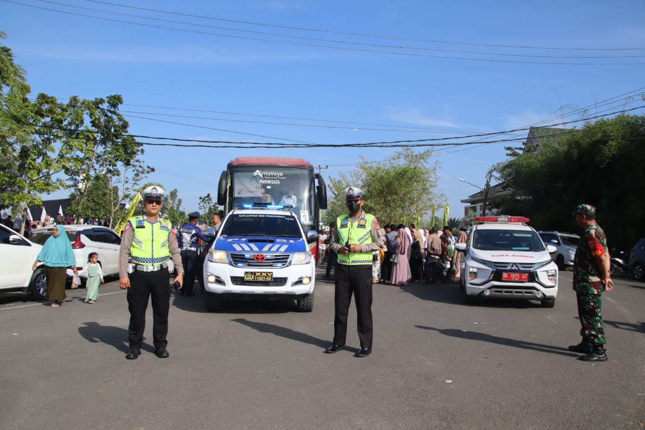 Pringsewu, LAMPUNG – Maspolin.id|| Polres Pringsewu, Polda Lampung, menerjunkan ratusan aparat untuk melakukan pengamanan dan pengawalan pemberangkatan jamaah haji asal kabupaten Pringsewu yang dipusatkan di depan Kantor Pemerintah Kabupaten Pringsewu pada Senin pagi (5/6/2023)