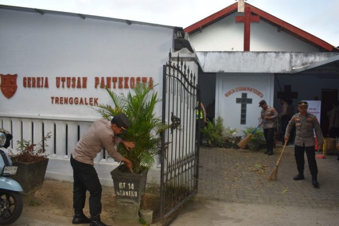 Usut punya usut, kehadiran petugas kepolisian ini adalah bagian dari kegiatan `Bakti Religi` dimana fokus kegiatan yang bersifat sosial ini adalah membantu membersihkan tempat ibadah di seluruh Kabupaten Trenggalek.