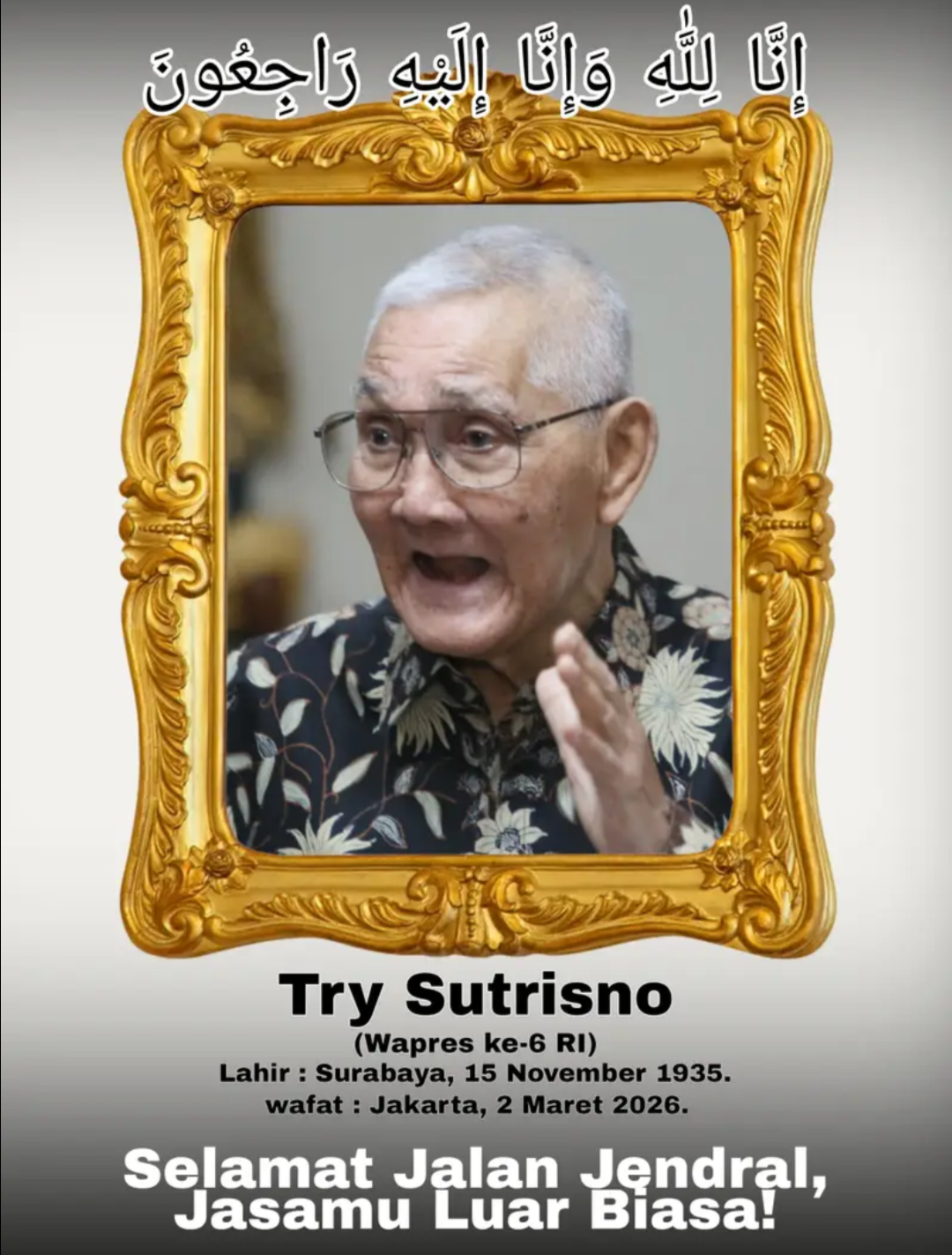 JAKARTA – Maspolin.id|| Berita duka menyelimuti tanah air. Mantan Wakil Presiden Republik Indonesia ke-6, Jenderal TNI (Purn.) H. Try Sutrisno, telah berpulang pada usia 90 tahun.