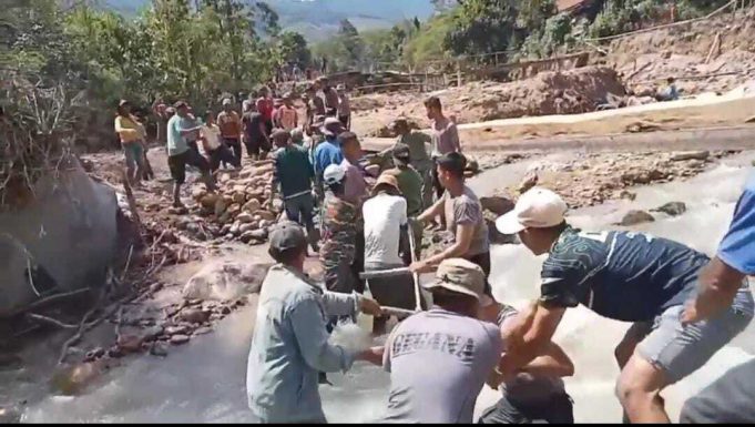 Personel Polri bersinergi dengan Babinsa serta warga setempat. Mereka bahu-membahu melangsir balok-balok kayu yang digunakan sebagai rangka dan lantai jembatan darurat, mencerminkan semangat gotong royong di tengah situasi pascabencana.
