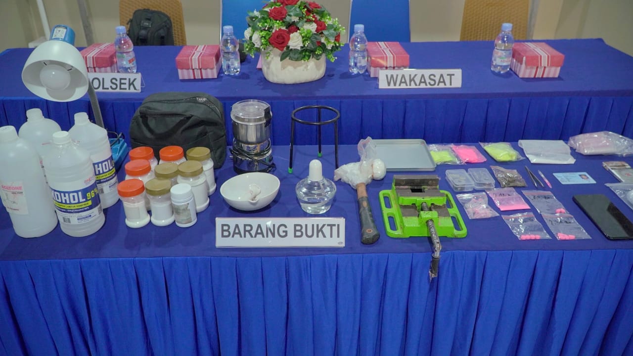Adapun barang bukti yang diamankan antara lain pil ekstasi berbagai motif, bubuk warna pink siap cetak, plastik klip bening, alat cetak pil, blender, alat pres, bahan kimia, alat takar, serta dua unit handphone yang digunakan dalam aktivitas peredaran narkotika.