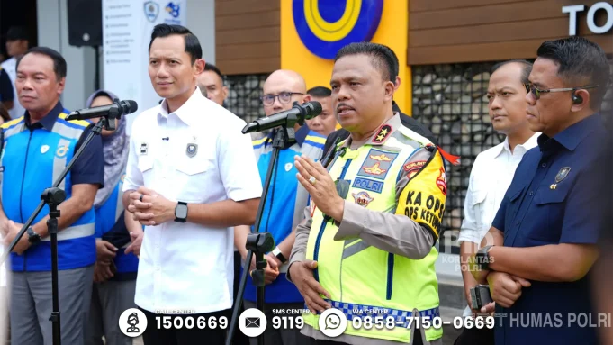 Bekasi, JAWA BARAT – Maspolin.id|| Kepala Korps Lalu Lintas (Kakorlantas) Polri Irjen Pol. Agus Suryonugroho, mendampingi Menko Infrastruktur dan Pembangunan Kewilayahan Agus Harimurti Yudhoyono memantau arus mudik Lebaran di Jasa Marga Tollroad Command Center Jatiasih, Bekasi, Kamis (19/03/2026).