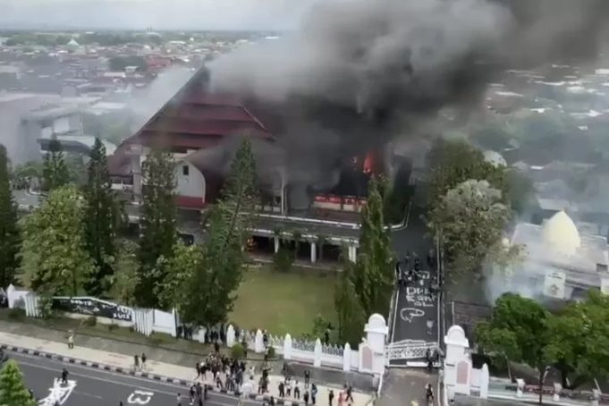 MATARAM, NTB – Maspolin.id|| Gedung DPRD Provinsi Nusa Tenggara Barat (NTB) dibakar masa aksi pada Sabtu (30/8/2025). Kobaran api membumbung tinggi membakar seluruh kantor DPRD NTB di Jalan Udayana, Kota Mataram. Masa masuk ke Gedung DPRD NTB melalui pintu gerbang selatan yang sudah jebol pada demo sebelumnya. Suasana semakin memanas saat masa meringsek masuk dan melempar batu serta membakar sejumlah kursi dan membakar Gedung DPRD NTB.