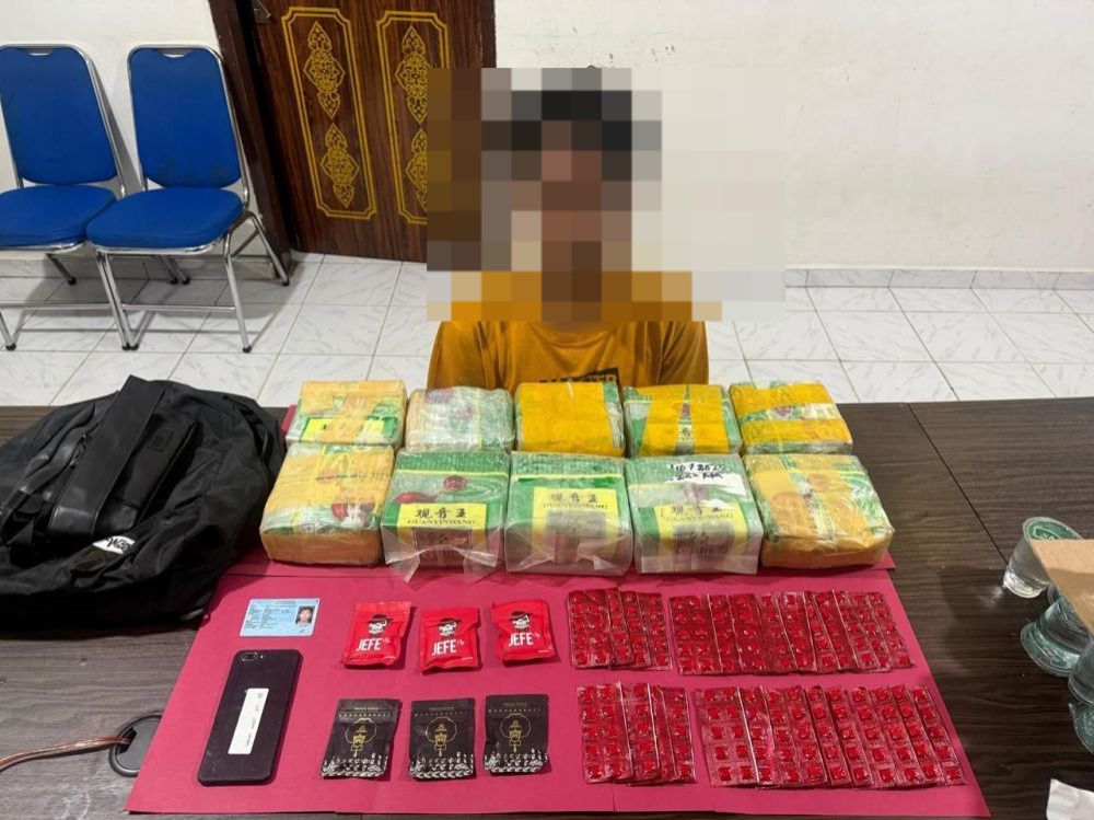Dari tangan pelaku berinisial SE (29), petugas menyita satu tas ransel hitam berisi 10 bungkus besar sabu merek Guanyinwang seberat total 10 kilogram, 28 strip pil Happy Five, serta enam bungkus ganja kering dengan berbagai merek.