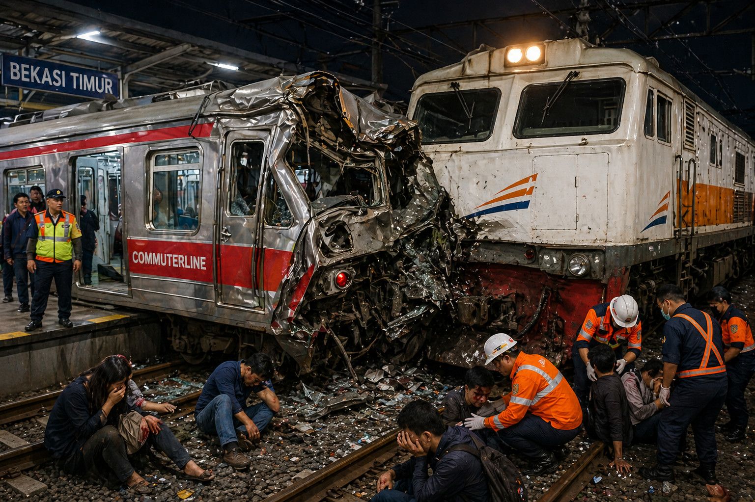 Bekasi, JAWA BARAT – Maspolin.id|| Basarnas mengerahkan personel elit Basarnas Special Group (BSG) untuk menangani kecelakaan kereta yang melibatkan KRL di Stasiun Bekasi Timur, Senin malam.