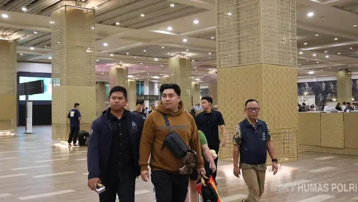 Dalam foto yang diterima detikcom, Rifaldo terlihat diamankan di area bandara dengan pengawalan dari NCB Interpol Indonesia dan mengenakan sweater berwarna cokelat.