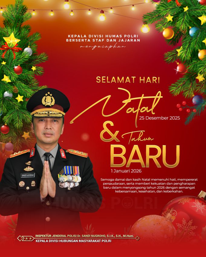 JAKARTA – Maspolin.id|| Kepala Divisi Humas Polri Irjen Pol. Sandi Nugroho, menyampaikan ucapan Selamat Hari Natal 25 Desember 2025 dan Tahun Baru 1 Januari 2026 kepada seluruh masyarakat Indonesia.