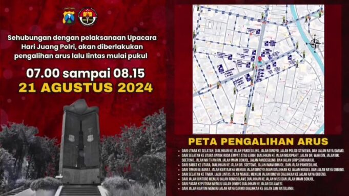 “Jalan akan kami lakukan pengalihan sejak simpang empat dari arah Kertajaya ke Pasar Keputran. Kendaraan dari arah Ngagel menuju Dinoyo akan kami aliran juga menuju Jalan Gubeng. Kami meminta maaf apabila selama upacara Hari Juang Polri mengganggu perjalanan masyarakat Surabaya,” kata dia.
