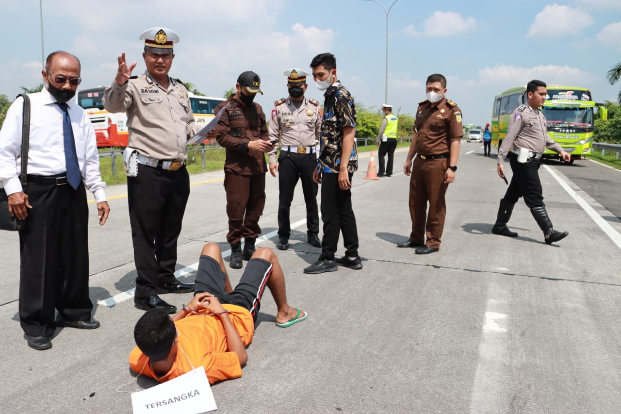 maspolin.id, Mojokerto – Satlantas Polresta Mojokerto bersama Kejaksaan Negeri Kota Mojokerto melakukan rekontruksi kecelakaan bus pariwisata PO Ardiansyah di KM 712+200 Jalur A Tol Surabaya-Mojokerto (Sumo) yang mengakibatkan 16 orang tewas dan 18 orang mengalami luka-luka, masih ada yang dirawat di Rumah Sakit. Jumat (03/06/22)